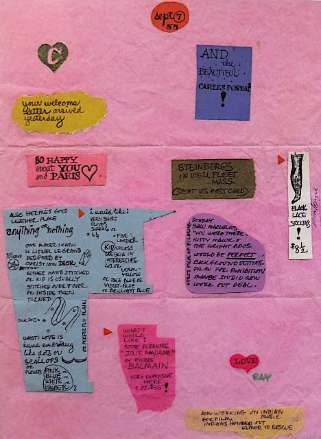 A beautiful hand-made letter from Ray Eames to Charles Eames, 1955. He was in Paris and beside the lovely words she did send some kind of fashion wish list, including gloves from Christian Dior, black lace stockings and the perfume Jolie Madame by Balmain. Good taste!