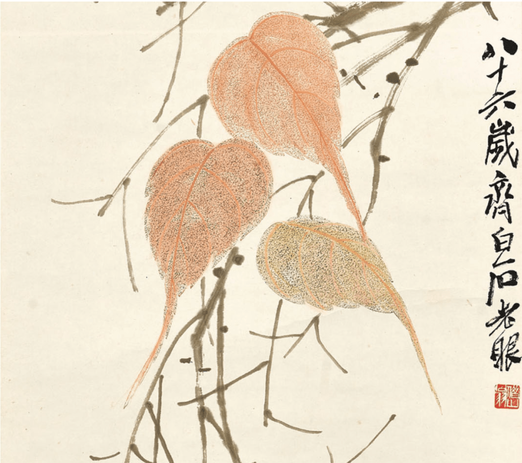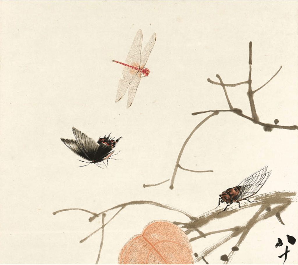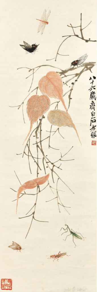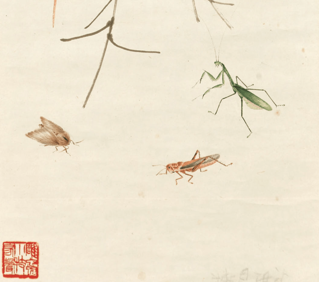 Insects and Leaves is the title, and chinese artist Qi Baishi (1863-1957) is here 100% into details. The praying mantis looks like something out of a zoology textbook, same like the dragon fly, whereas the leaves are more free style, even though they are also botanically correct.