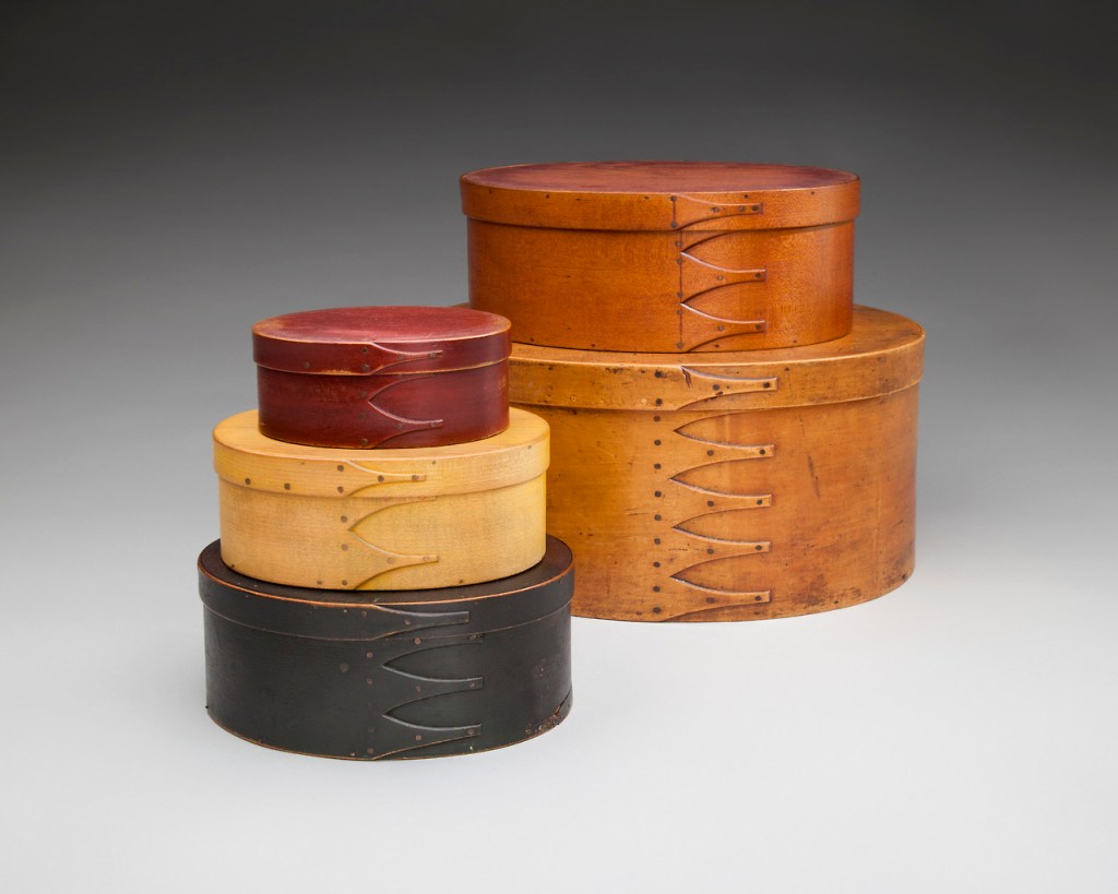 Shaker Design. Oval boxes, ca. 1830-50. Canterbury or Mount Lebanon. Made for the Community or the World. Wood, Stain, Metal. Benjamin Rose Collection. Photo SFO Museum.