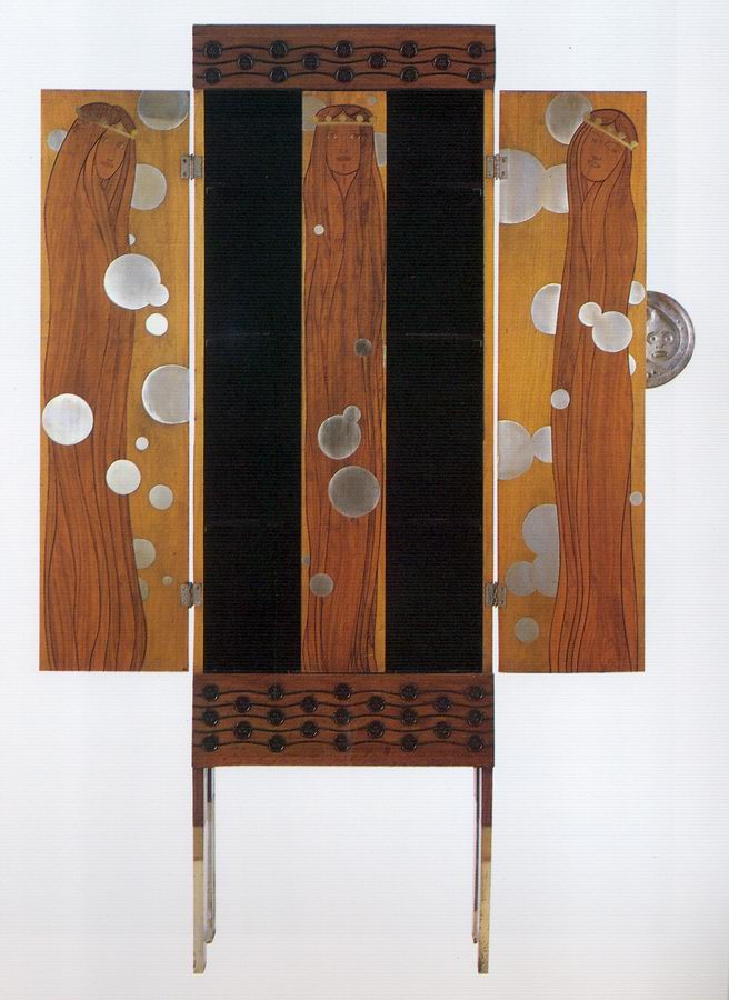 Koloman Moser, Armoire, 1900. Palisander, feet in copper and electroplate metal, applications of silver copper, glass of luster effect, black paint. 193 cm high.