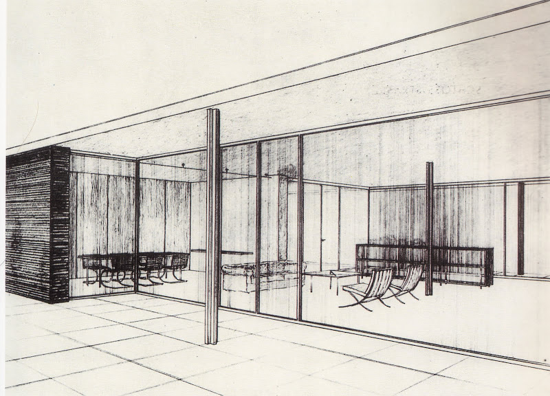 Mies van der Rohe only taught senior-semester students, and his classes – as the highest stage of the curriculum – gave a chiefly aesthetic training in the spirit of his own philosophy and architecture. Major themes included the harmony between open space and its limits. Since many students adopted both forms and materials from Mies, virtually everything was a cope of the Master. Günter Conrad placed his teacher’s Weissenhof chair at the table on the left and his Barcelonachair on the right. Source