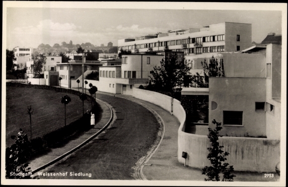 The postcard shows a view of the Weissenhof Estates as they were originally exhibited in summer 1927 in Stuttgart. The dwellings show a similar visual language. They are rectangular and designed in a minimalist way, without any decorative ornament. The apartments, single-family homes and row-houses are standardized and therefore fit neatly with each other. Most of them were also painted similarly in an off-white hue. However, they are not alike since every architect was given a lot of artistic freedom to put his idea of modernism into reality. 17 Architects from all over Europe contributed towards erecting 32 buildings for this one of a kind exhibition by the “Deutscher Werkbund”. -Agata Strausa