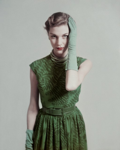 Model is wearing a fern shadowed dress in green by Herbert Sondheim with beads around neck wearing matching green gloves. Image by © Condé Nast Archive/Corbis, February 1948 by dovima_is_devine_II on Flickr.