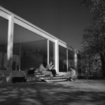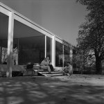 Mies van der Rohe chatting & lighting a cigar with others at the just-completed Farnsworth House (1951).