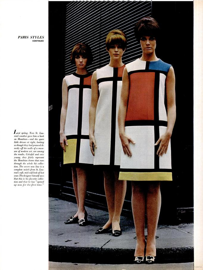 On August 2 1965, Yves Saint Laurent created a series of the color-blocked wool and jersey shift dresses, inspired by the Dutch Abstract Impressionist, Piet Mondrian, dubbed the ‘Mondrian Look.”