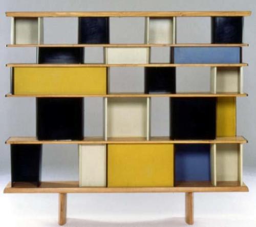 The Bibliothèque Mexique emphasizes industrial materials, clean lines, and free-form shape. Its pleasing rhythm of colored panels and open spaces made it an engaging addition to the dormitories in the Maison du Mexique, a specialty dorm for Mexican students at the Cité Universitaire in Paris. Within the bookshelf, wooden horizontal elements are separated by modular painted aluminum panels that slide back and forth to configure the various compartments.