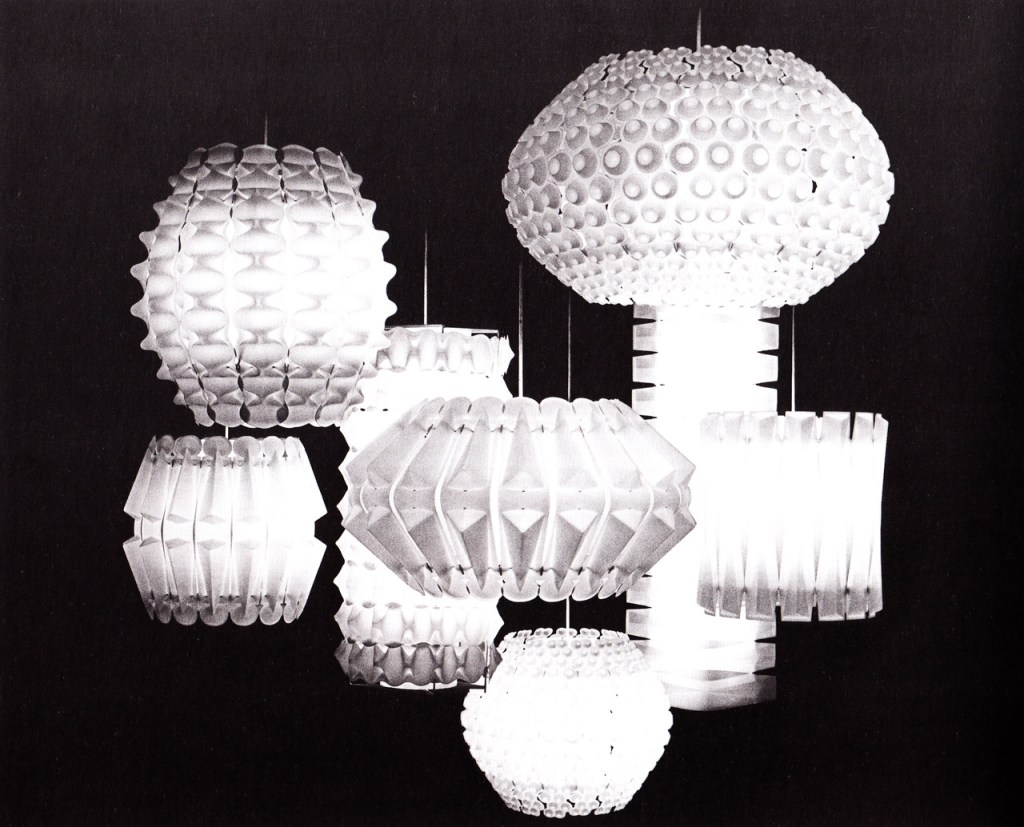 George Nelson is well known for his Plastic Bubble lamps but his office produced a whole host of other lighting fixtures. Designed in 1960, the ‘Lantern’ lights were pieces of cut vinyl, moulded and clipped around a cylindrical styrene diffuser. Using differing tensions and outer hoop sizes, various shapes could be formed using the same basic components. The depth created by the play of light and shadow is beautiful, and all from a simple piece of plastic! www.theimportanceofbeingmodernist.com
