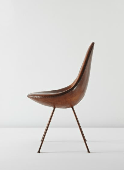 Arne Jacobsen, rare and important “Drop” chair, ca. 1958. Leather, copper-plated steel. Manufactured by Fritz Hansen, Denmark. Sold for $37,500. Source Phillips.