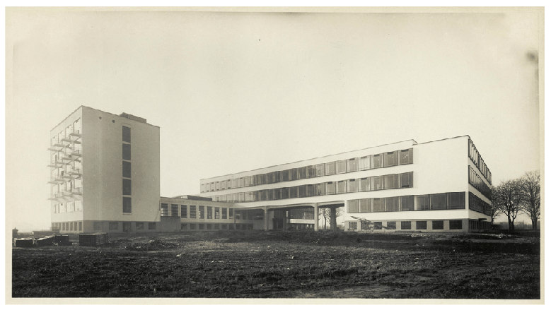 Bauhaus Dessau, 1925-26, photo by Lucia Moholy. This view from the northeast was one of a series of photographs used to publicize the school (a similar image appeared on Herbert Bayer’s invitation to the opening 1926). Bauhaus Archiv Berlin.
