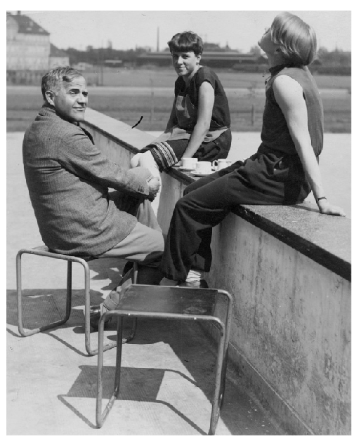 Hannes Meyer with student Hilde Reindl on the balcony of the Bauhaus building, 1928. Hannes Meyer, seated on Marcel Breuer stool, was the school’s director from 1928-30. His personable manner and egalitarian outlook made him popular with students, despite the controversies surrounding his political outlook and his dismissal 1930. Bauhaus Archiv Berlin. Photo: Umbo (Otto Umbehr)