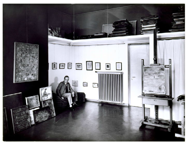 Paul Klee in his studio in the Master’s house in Dessau, 1926. It was a double residence he did share with Kandinsky. It was decorated to its occupant’s taste. Klee used color to demarcate the function of the walls: he painted his canvases on the black wall and exhibited finished work on the white wall. Photograph: Lucia Moholy.