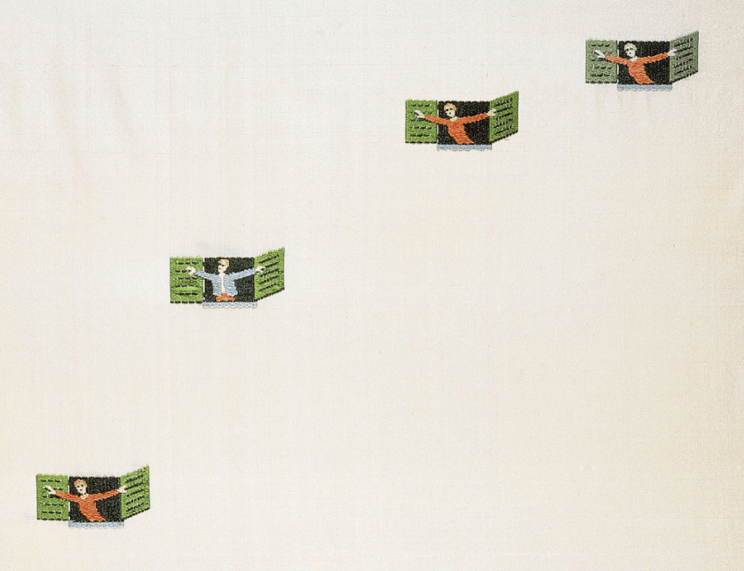 Gio Ponti, fabric design, Morosi alla finestra, embroidered silk, 1933. © Gio Ponti Archives, Milano