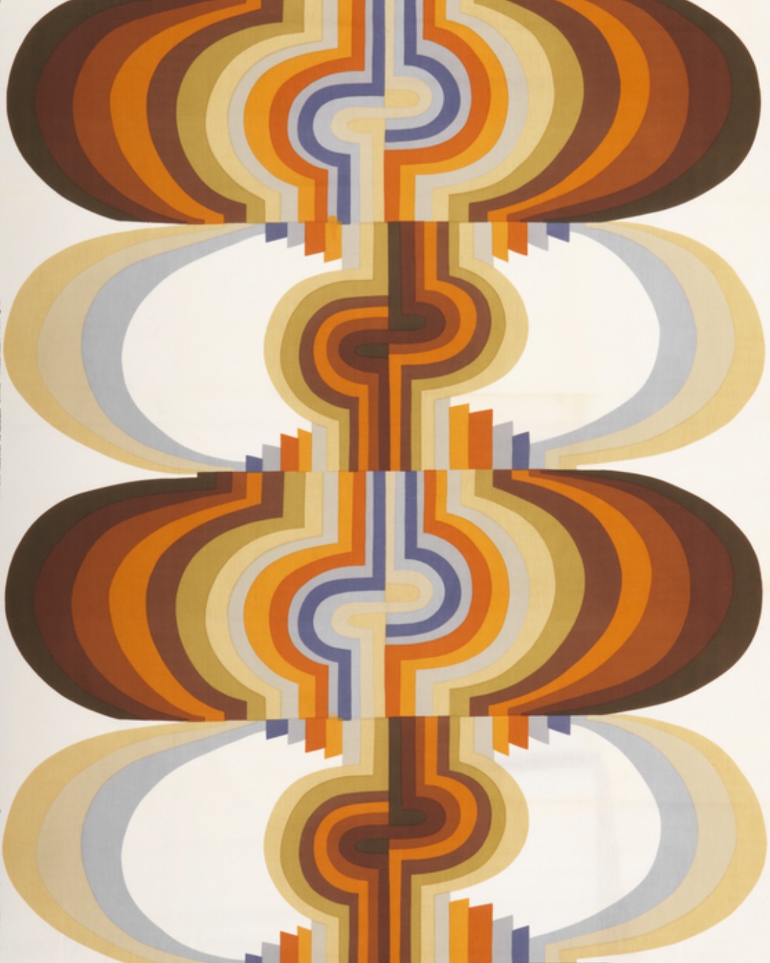 Francisca Reichardt studied textile design at the Hochschule für bildende Künste Hamburg in Germany, under the renowned German print designer, Margaret Hildebrand. In 1971, Reichardt’s textile “Omahar” was produced by Knoll Textiles and printed by Pausa AG, Germany. It was a technical tour-de-force, requiring 14 screens to print its 30 ½-inch repeat. Via Cooper Hewitt