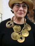 Ladies with Calder Jewelry. 1| Imogen Cunningham of Margaret Schevill wearing a neck piece and earrings, 1950. 2| Peggy Guggenheim 3 | Helen Drutt, wearing her Alexander Calder necklace at the Barnes Foundation dedication, Caption and Image © The Jewelry Loupe 4 | Simone de Beauvoir 5 |Angelica Huston wearing Alexander Calder’s necklace entitled “The Jealous Husband” for the 1976 cover of New York Magazine. 6| Georgia O’Keeffe wearing the pin that Calder made for her. 7 | Louisa Calder