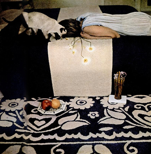 eszter haraszty on her bed with her own fabric design and her siamese cat Pancake.