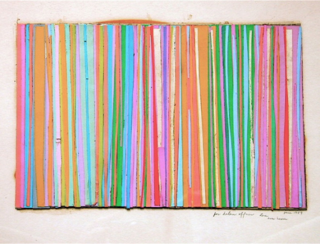 This multi-colored paper collage by Eva Hesse was made while she was an art student at Yale University. Hesse inscribed it, the month she graduated in June of 1959, as a gift to the infant daughter of fellow artist Elliot Offner who was also in the art program. It marks a critical moment when Hesse is exploring texture and color and still under the influence of Josef Albers (1888-1976) the well-known Bauhaus artist and teacher who was her professor at Yale and who had also previously taught at the experimental Black Mountain College. More about the relationship between Albers and Hesse here.