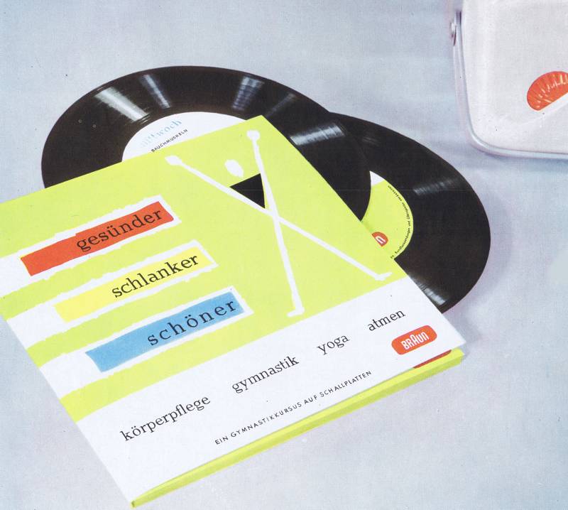 Braun, Gymnastik-Kurs auf Schallplatten. Gymnastics and yoga on vinyl, 1955. Innovative. Vinyl was launched in the US market in 1949.