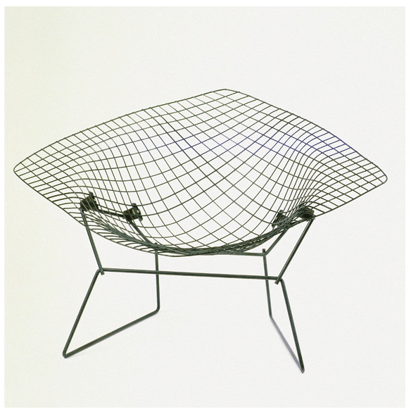 Harry Bertoia, No. 422, Diamond Chair, 1952-53. Manufactured by Knoll, since today. Coming from Italy, Bertoia was originally a sculptor. 1943 he went to California, to work with the Eames and Knoll. More in german here.