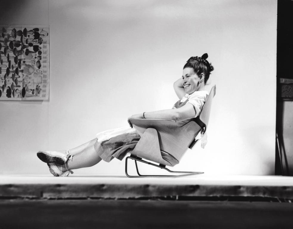Ray Eames, cheerfully sitting in a prototype of the Lounge Chair. © Courtesy Eames Office LLC