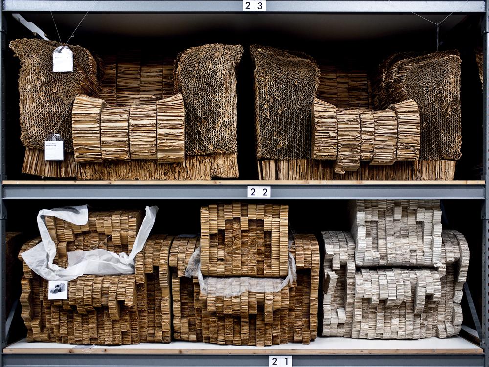 Vitra Design Collection, exclusive glimpse behind the scenes. Basement shelves with corrugated paper chairs by Frank Gehry: Grandpa Beaver (1987) and Little Beaver (1980). Photo © Christian Grund