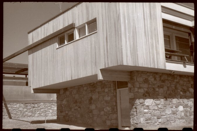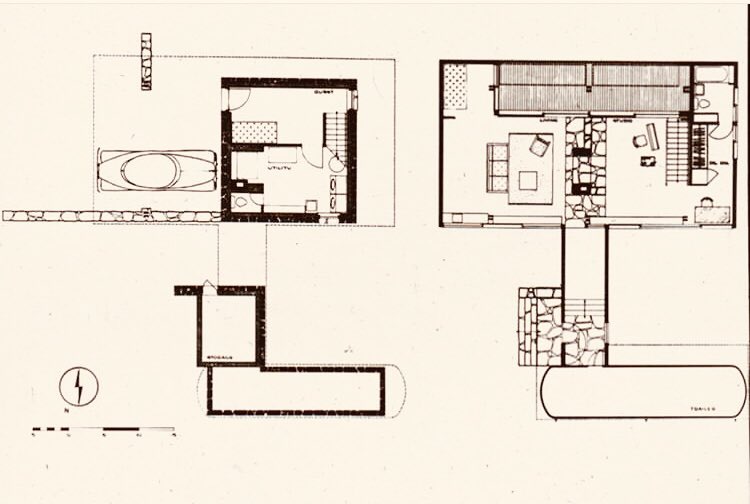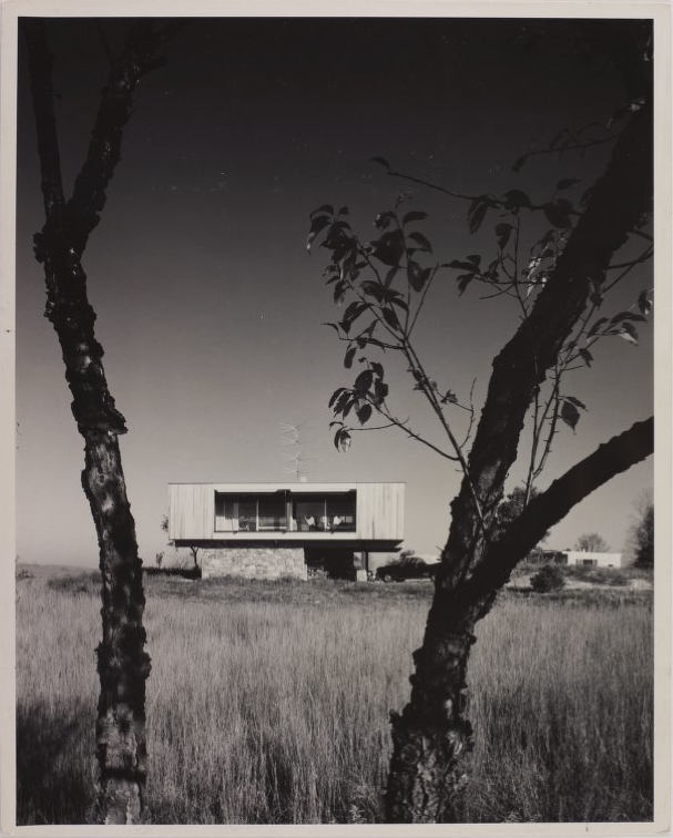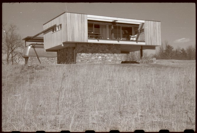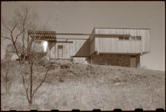 Sidney Wolfson asked Breuer to create a building around the trailer that he had been using as a studio. Breuer designed a wood-frame structure clad in vertical cypress which cantilevered over a smaller stone base.