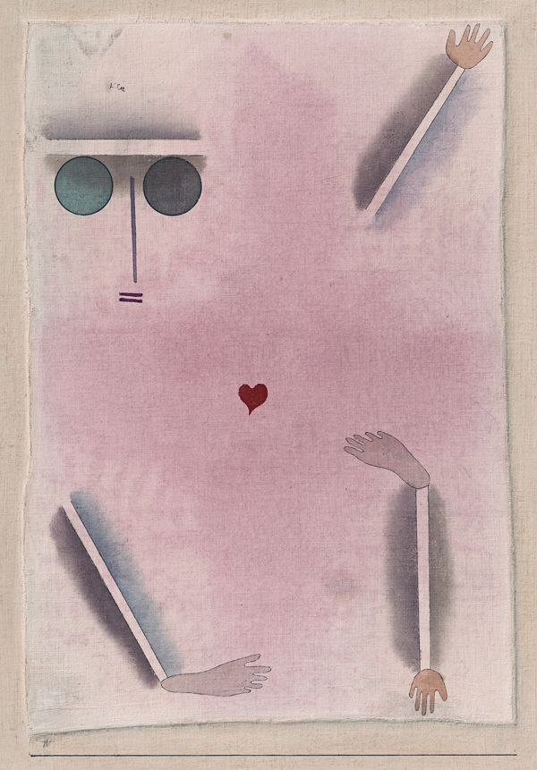 Paul Klee, Hat Kopf, Hand, Fuss und Herz / Has Head, Hand, Foot and Heart, 1930. Watercolour and pen on cotton, glued on cardboard, Kunstsammlung Nordrhein-Westfalen, Düsseldorf. More to read about Klee, this work and the art dealer Flechtheim here.