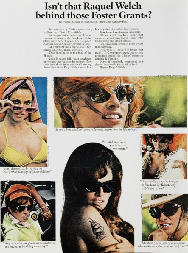 Foster Grant and the highly successful ad campaign for their sun glasses. It started 1965 and featured testimonials like Woody Allen, Peter Sellers, Mia Farrow, Antony Quinn or Raquel Welch (1968).