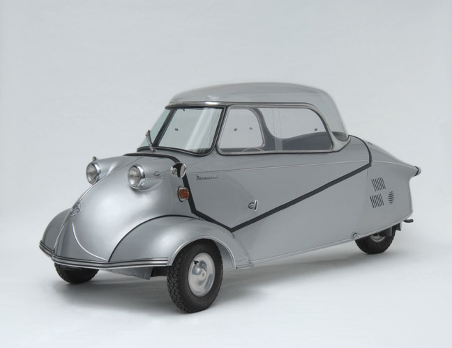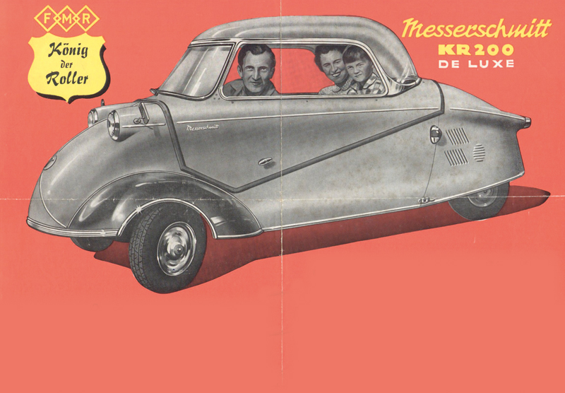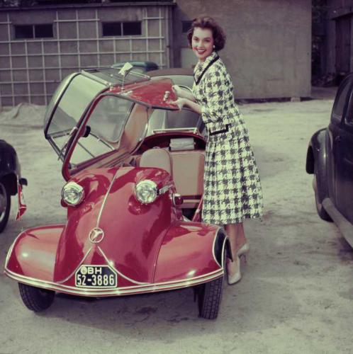 Fritz Fend, Messerschmitt Kabinenroller, german microcar, three-wheeler, 1955-1964. Fend was originally an aircraft engineer. Below: Actress Nadja Tiller with her smart car. Source