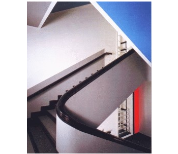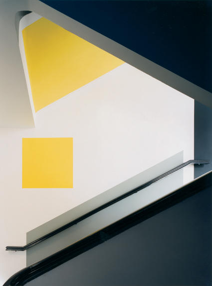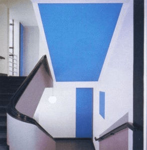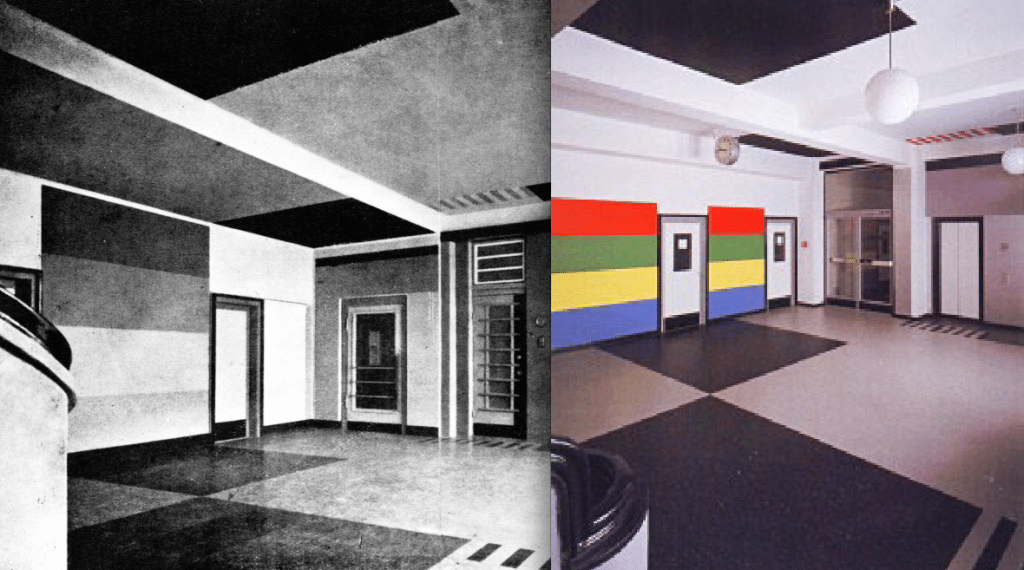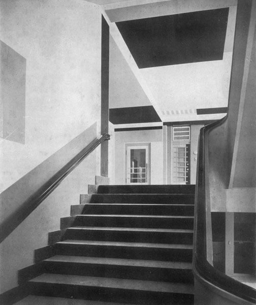 Alfred Fischer, architect & Max Burchartz, interior design, 1927. Treppenhaus Hans-Sachs-Haus, Gelsenkirchen – Ruhr Region, Germany, Anton Stankowski did support the works, being a student at the HSH School. Last photo on the right shows the reconstruction of the color coding system nowadays. Contemporary photo stairways © Deimel + Wittmar