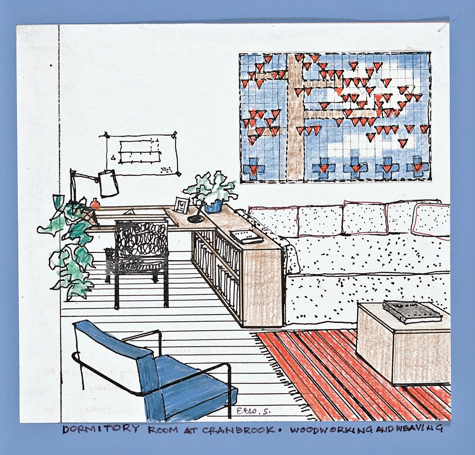 Florence Knoll (1918–2918) was a student in the reknown academy of Cranbrook. Already in 1934 her good taste and good feeling for space was evident in her sketches. Source, sketch ©Knoll