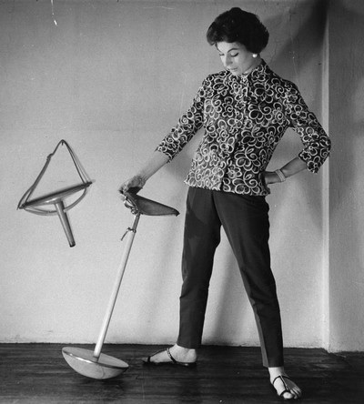 Achille Castiglioni, Sella telephone stool, 1957, for Zanotta. Designed with Pier Giacomo Castiglioni, to be used by his daughter. The lady here is a model, not his daughter 🙂