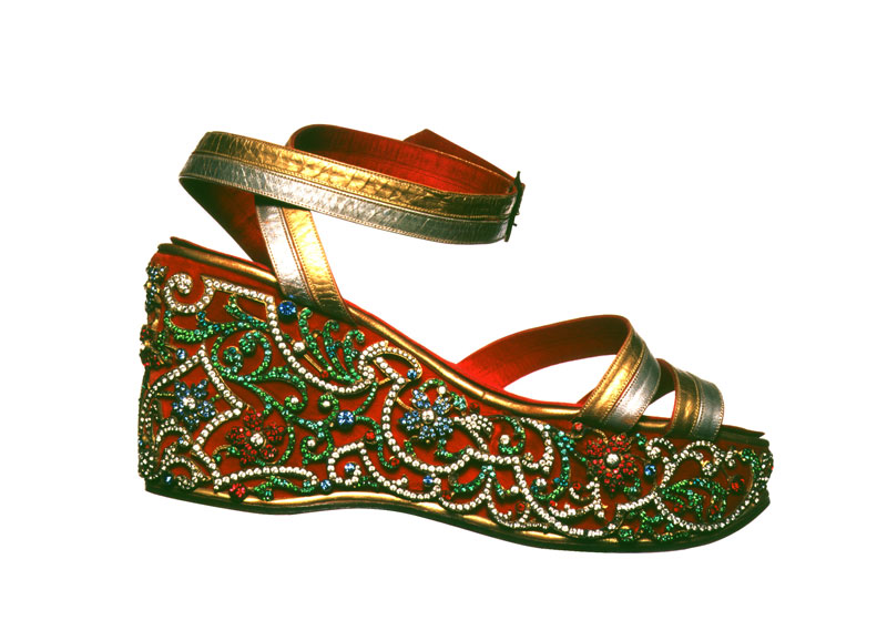 One of Ferragamo’s most famous customers in the late 1930’s was Indira Devi, the Maharani of Cooch Behar. The princess ordered even a hundred pair of shoes at a time, some of them adorned with real pearls and diamonds. In 1938 Salvatore Ferragamo created sandals for her with uppers composed of bands of kid and satin sewn together, a cork wedge (his latest invention) covered in velvet and embossed brass structure embedded with precious gems – rubies, emeralds, diamonds and other stones – that the Maharani had sent from India.