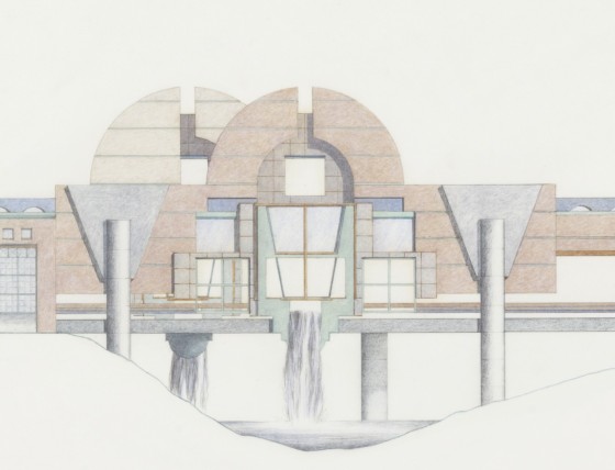 Michael Graves, Detail from Drawing, Fargo-Moorhead Cultural Center Bridge (South Elevation) Preliminary Study, 1979; Designed by Michael Graves; 1980-4-1. Collection of Cooper Hewitt, Smithsonian Design Museum.