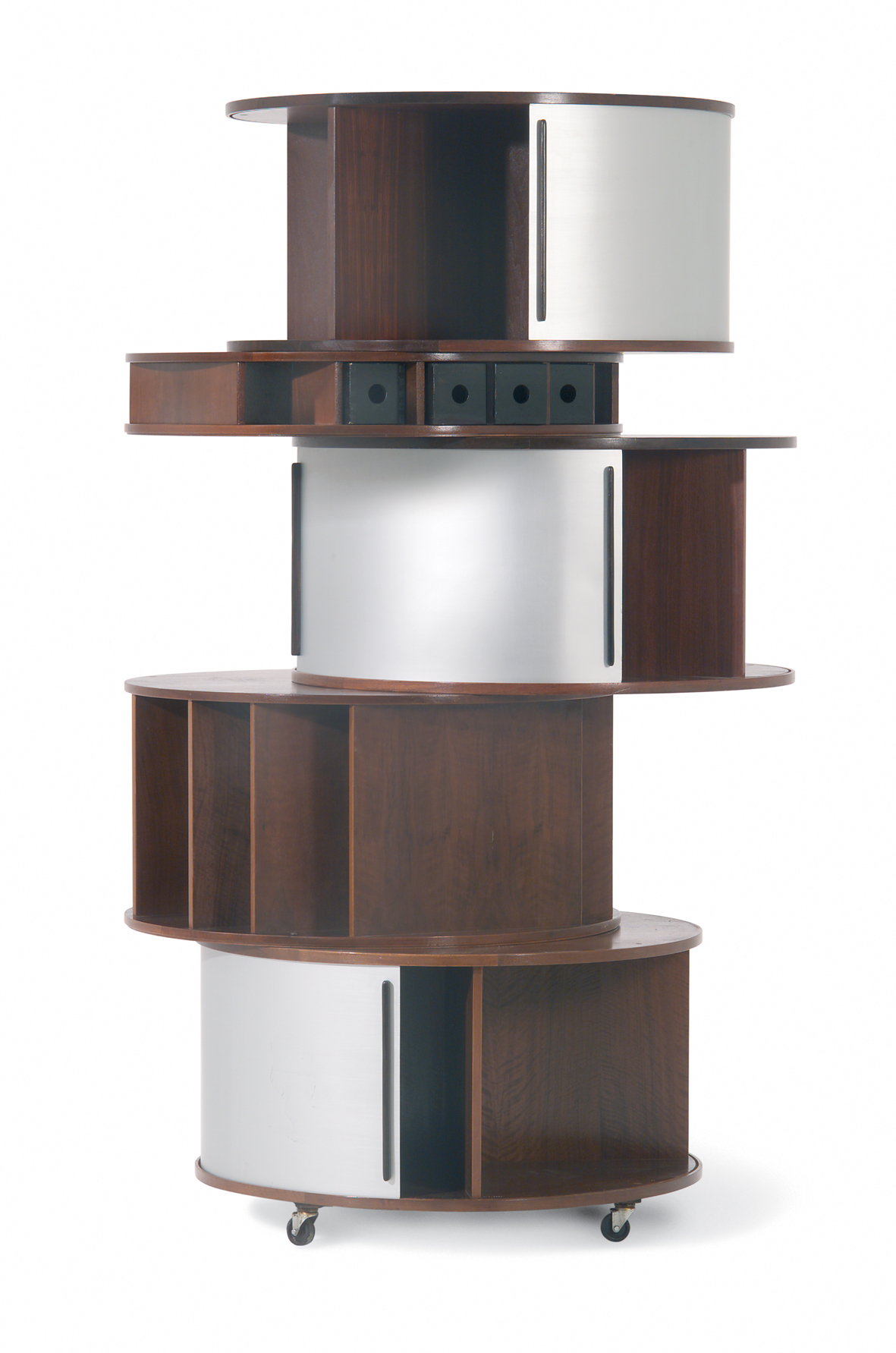 The Combi Center, designed in 1963, is a multifunctional, roll away piece of furniture formed by overlapping cylindrical objects made by wood and frosted aluminium.