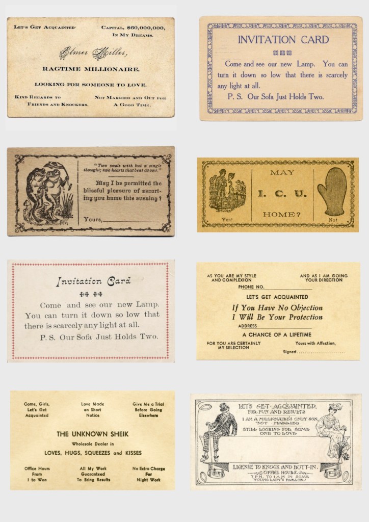 According to Alan Mays, who collects them, they were “used by the less formal male in approaches to the less formal female.” We think of nineteenth-century courtship as being impossibly straight-laced and buttoned-down, and certainly a printed card inquiring for permission to accompany a young miss to her door is consistent with that, but the eager men found plenty of ways to work clever jokes and insinuations into their calling cards. Via dangerousminds.