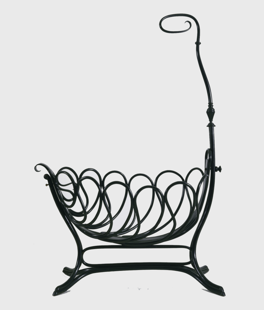 Bentwood designs became ubiquitous as seating for cafés and gardens and later as elaborate, upholstered domestic furnishings. Inexpensive, durable, light, and ideal for export because components could be assembled after shipping, pieces such as J. & J. Kohn’s cradle became perfect symbols of the new industrial age. The bentwood process had been developed by the German designer Michael Thonet in the mid-nineteenth century in order to make appealing functional furniture efficiently and economically. In 1867 the manufacturer J. & J. Kohn became Thonet’s chief competitor, opening factories in several international locations.