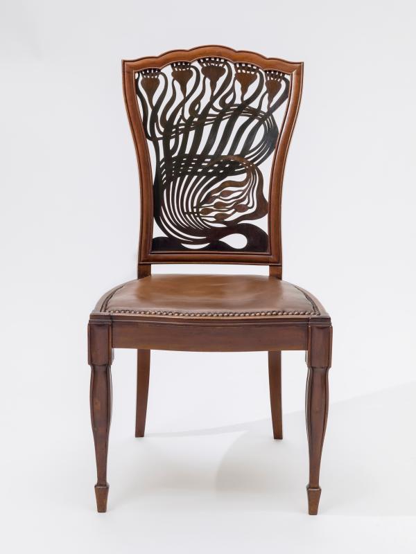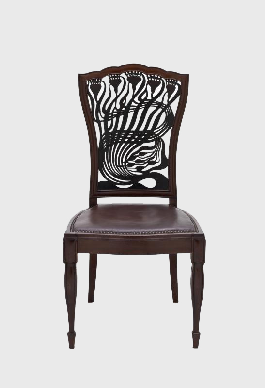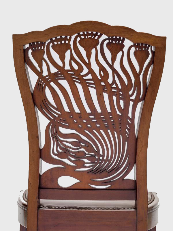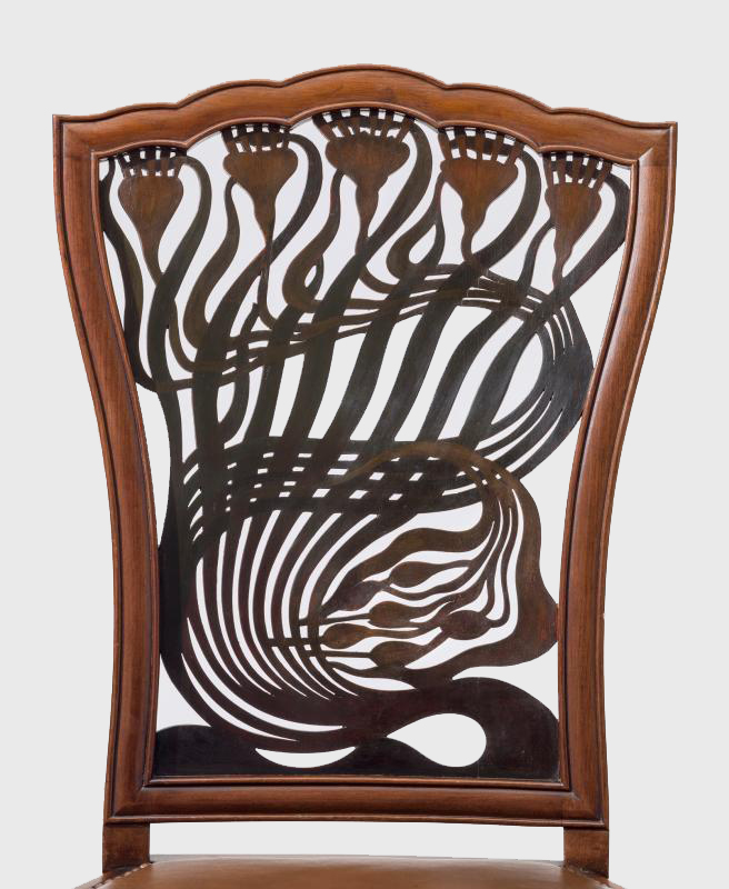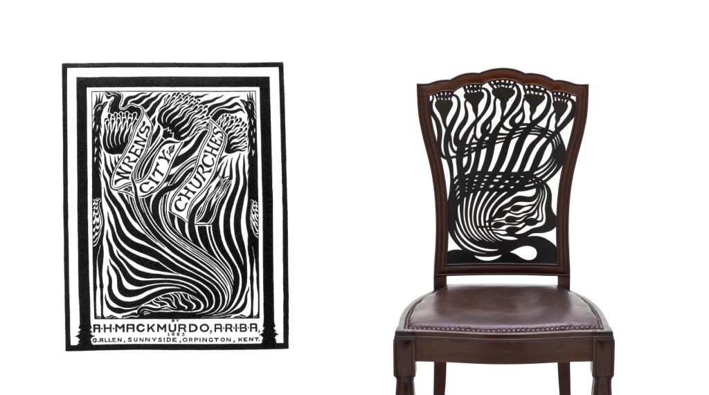 Often cited as one of the origins of Art Nouveau, A.H. Mackmurdo’s chair design incorporates a striking innovation: a backrest reminiscent of floating seaweed – appealingly decorative even today. The iconic motif, later known as a whiplash curve, anticipated the organic forms that would define the movement, from Horta’s Hôtel Tassel in Brussels to the Metro Stations of Hector Guimard or the posters of Alphonse Mucha.