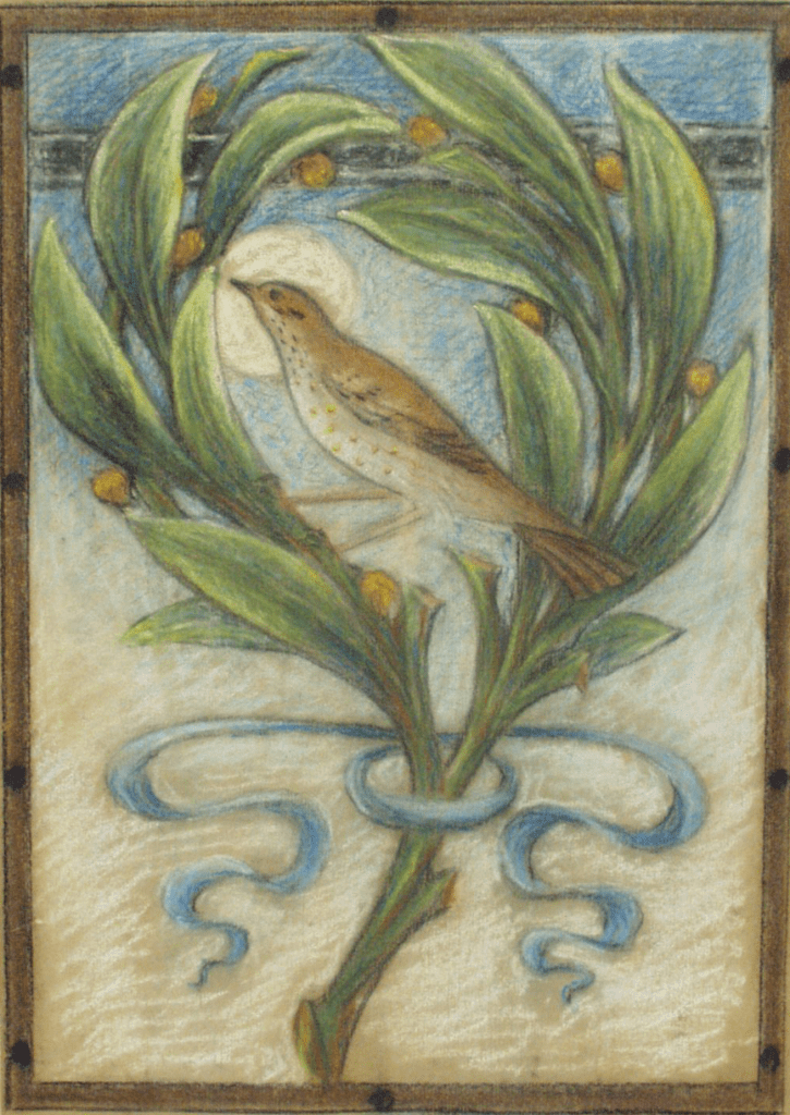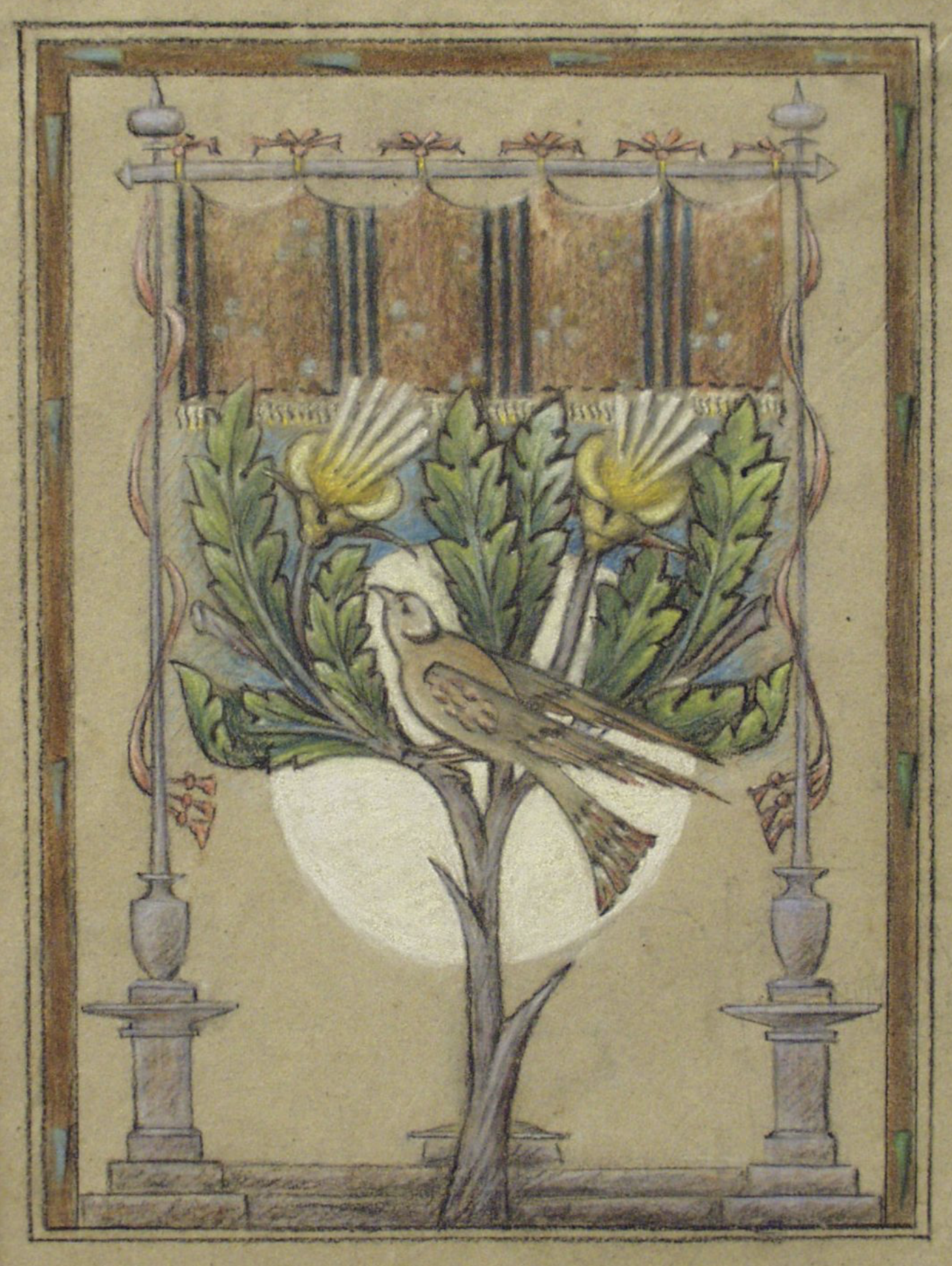 Drawings by A.H. Mackmurdo, made decades apart but sharing a familiar stillness. One, from 1898, shows a bird perched on a branch, moon rising behind it. The other, from 1920, features a bird nestled in leaves, the branch bound with a ribbon.