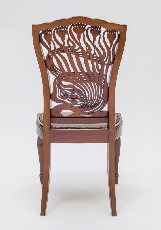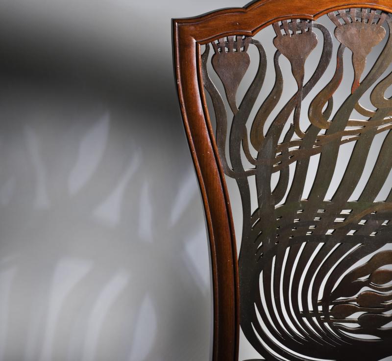 By contrast, the legs and the seat of the mahagony chair follow the Georgian tradition of the 1780s. Originally painted in green and red, the surviving examples are now much faded, as noted by the Victoria and Albert Museum. It is believed that either six or eight were produced in total, only five have been found.