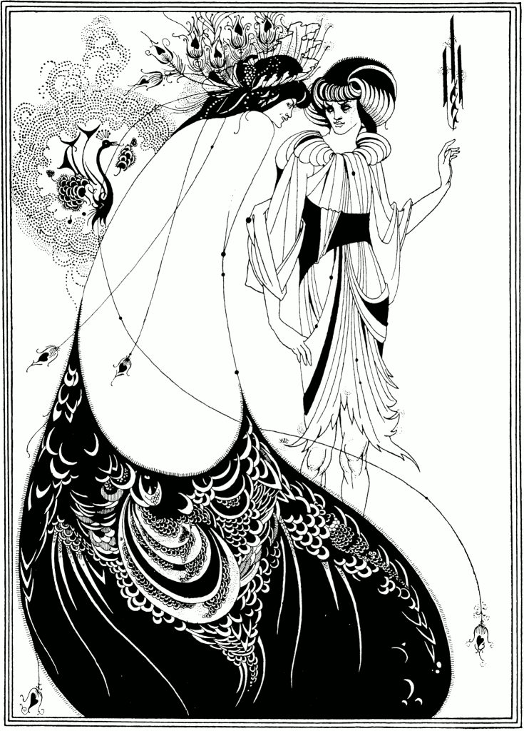 The Peacock Skirt, 1893 illustration by Aubrey Beardsley for Oscar Wilde’s play Salomé. Pen and ink drawing, 17.8 x 12.7 cm (7.0 × 5.0 in). Fogg Art Museum, Harvard University. Wiki commons