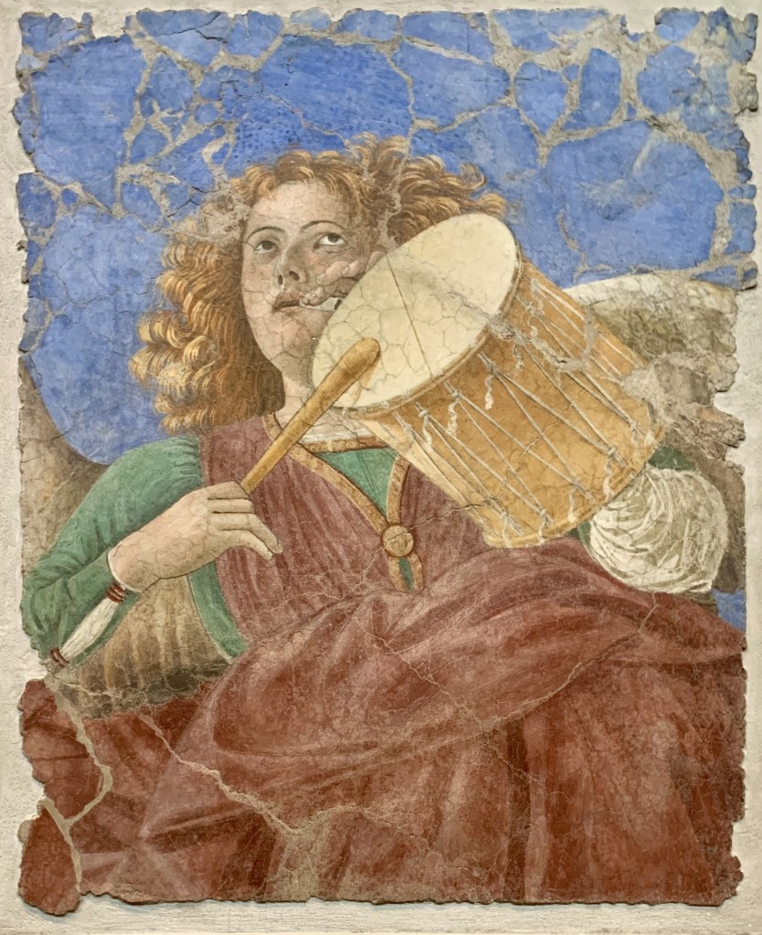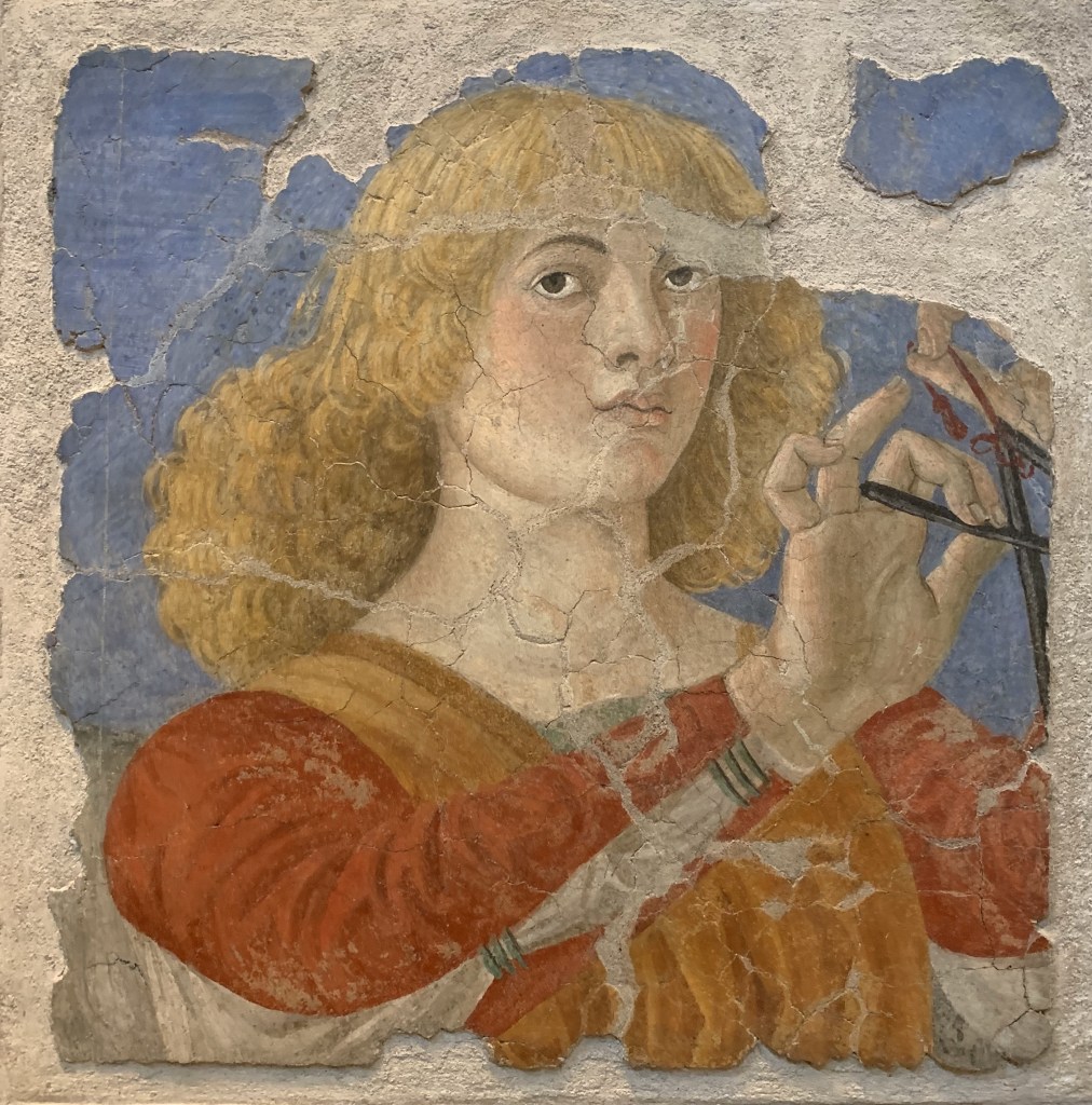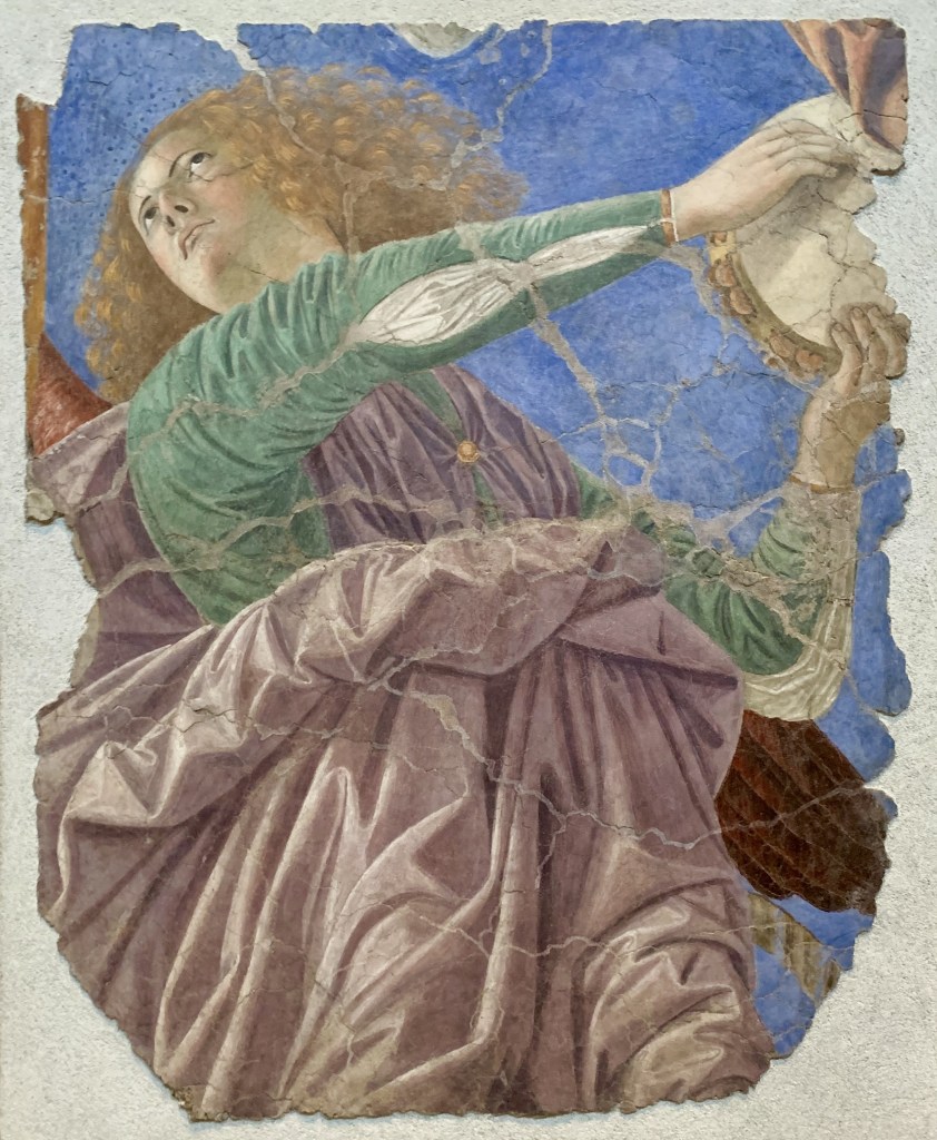 What makes the angels exceptional is not only their beauty and elegance, but their spatial realism. Melozzo da Forlì (circa 1438 – 1494) was a master of di sotto in sù, the dramatic foreshortening of figures seen from below. They appear to float above the viewer, their bodies twisting naturally in space, while their instruments are rendered with attention to structure and proportion.
