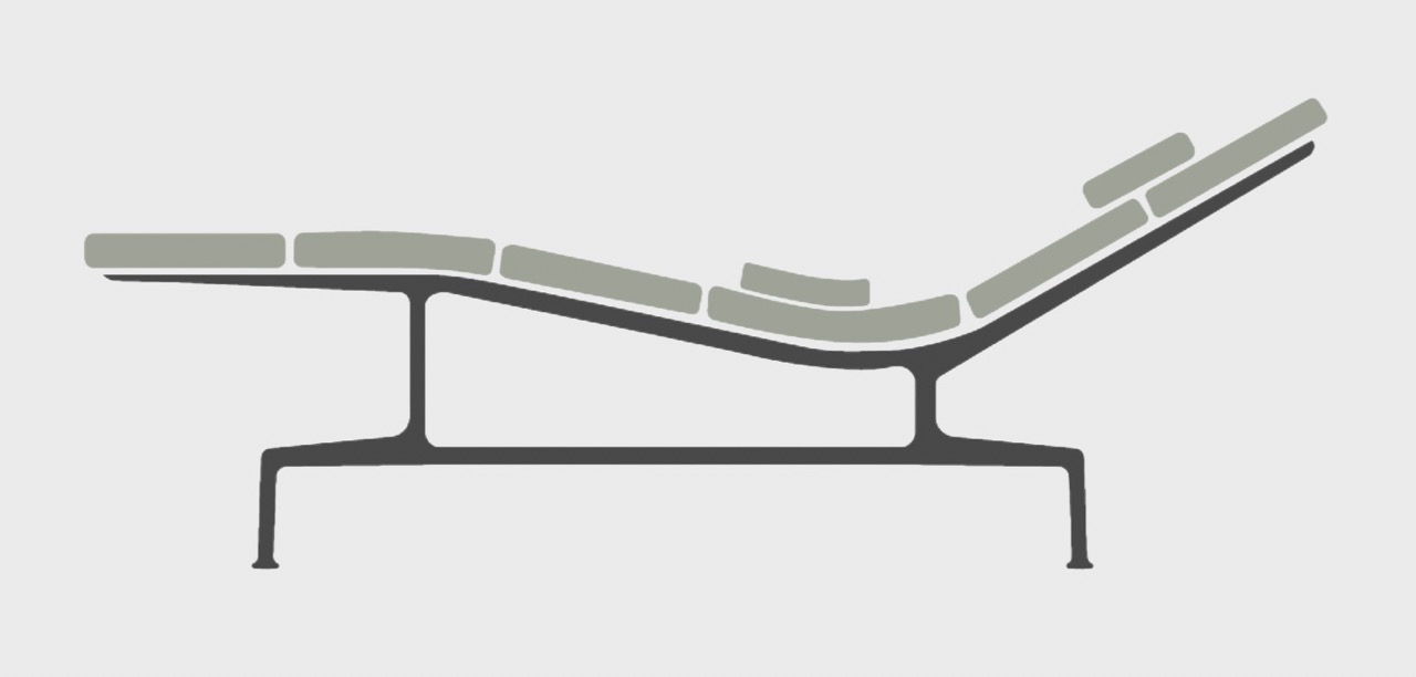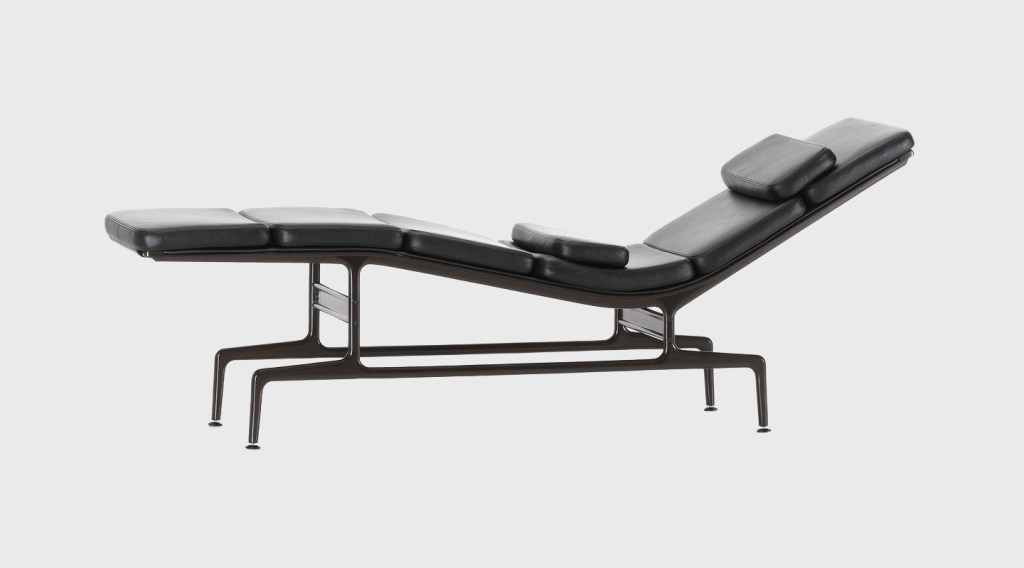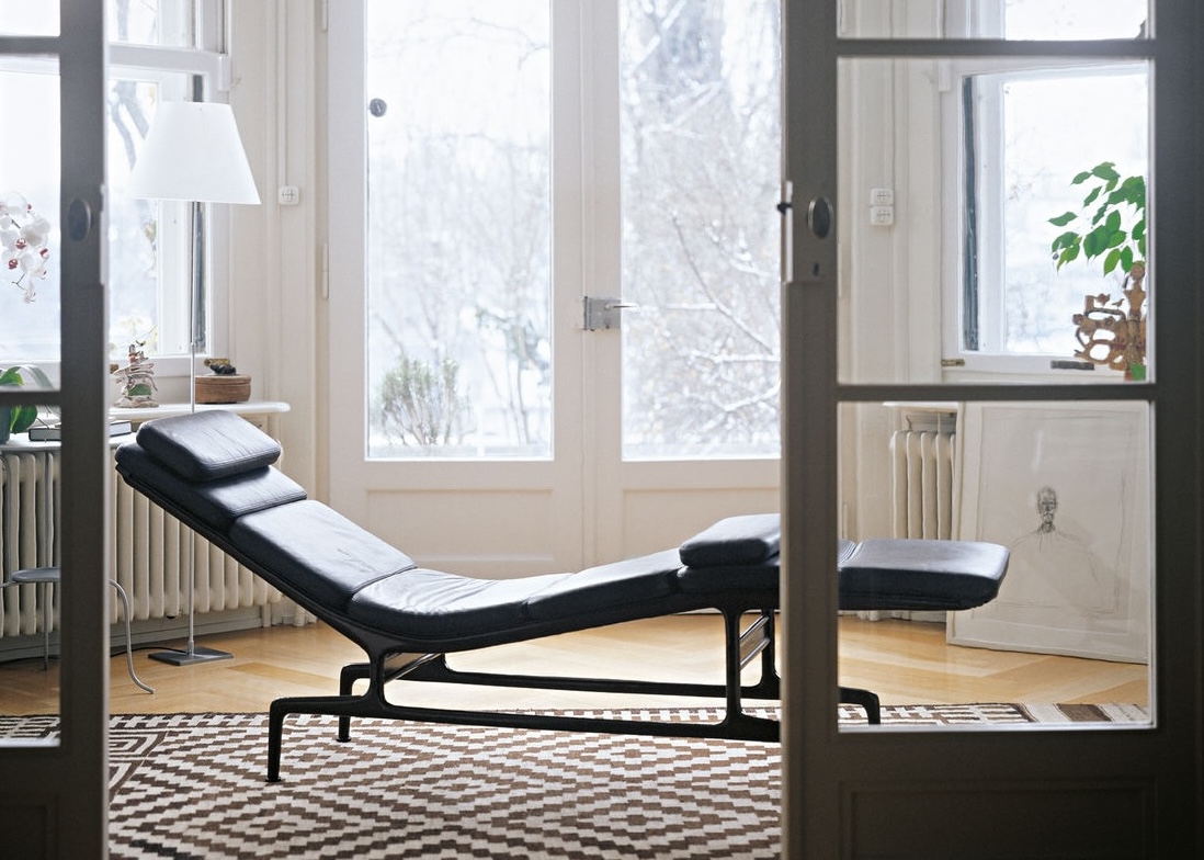 The Eames had no intention of mass-producing the chaise until Herman Miller expressed interest. Released officially in 1968, the Eames ES106 Chaise Longue became known as the Billy Wilder Chaise. It featured six zippered leather cushions mounted on an aluminum frame, plus two loose cushions for added comfort. Early versions were produced in black leather with an aubergine-toned frame, aligning it closely with the broader Soft Pad program of the late 1960s. Nowadays Vitra as authorised European manufacturer of Eames furniture is producing the chaise longue as part of its classic collection.