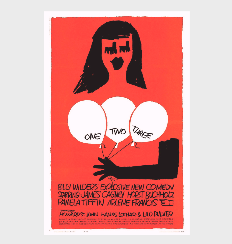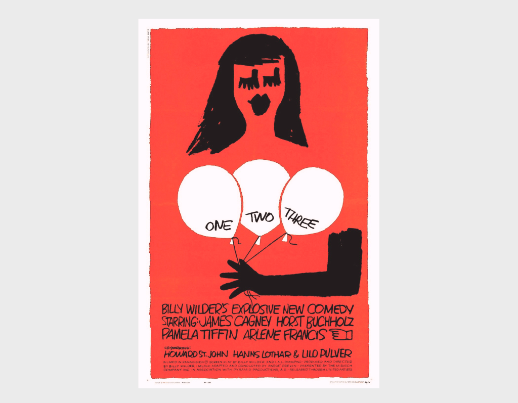 Alongside Some Like It Hot, this audacious, really funny film is my absolute favourite by Billy Wilder … maybe because I am german 😉 The movie poster for One, Two, Three was designed by Saul Bass in 1961.
