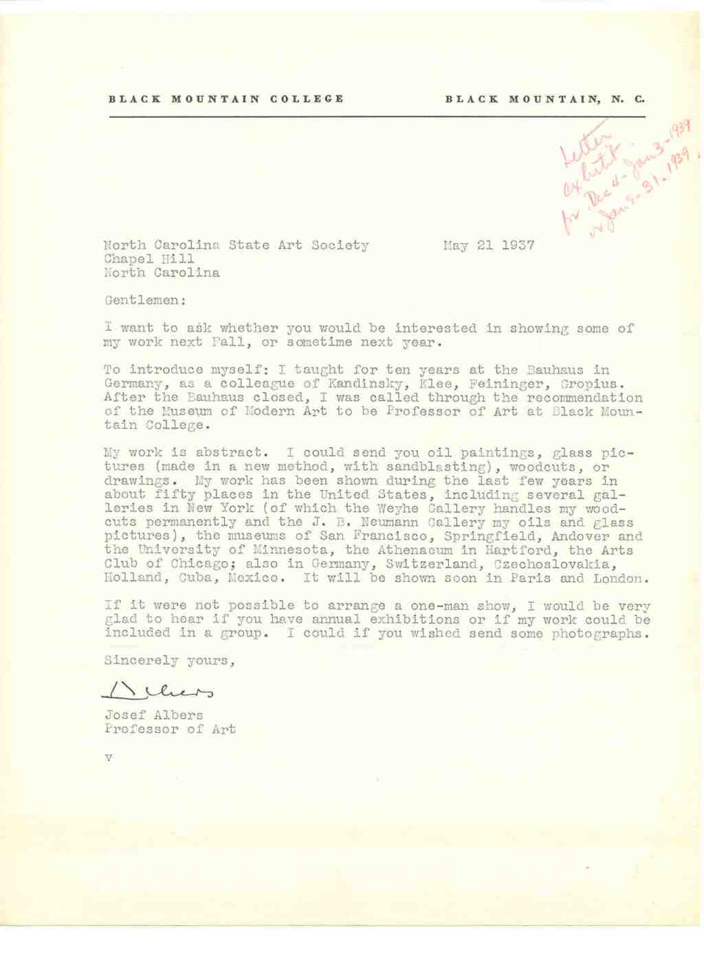 “My work is abstract”. Letter from Josef Albers, inquiring about possibilities for exhibition at the University of North Carolina. 1937